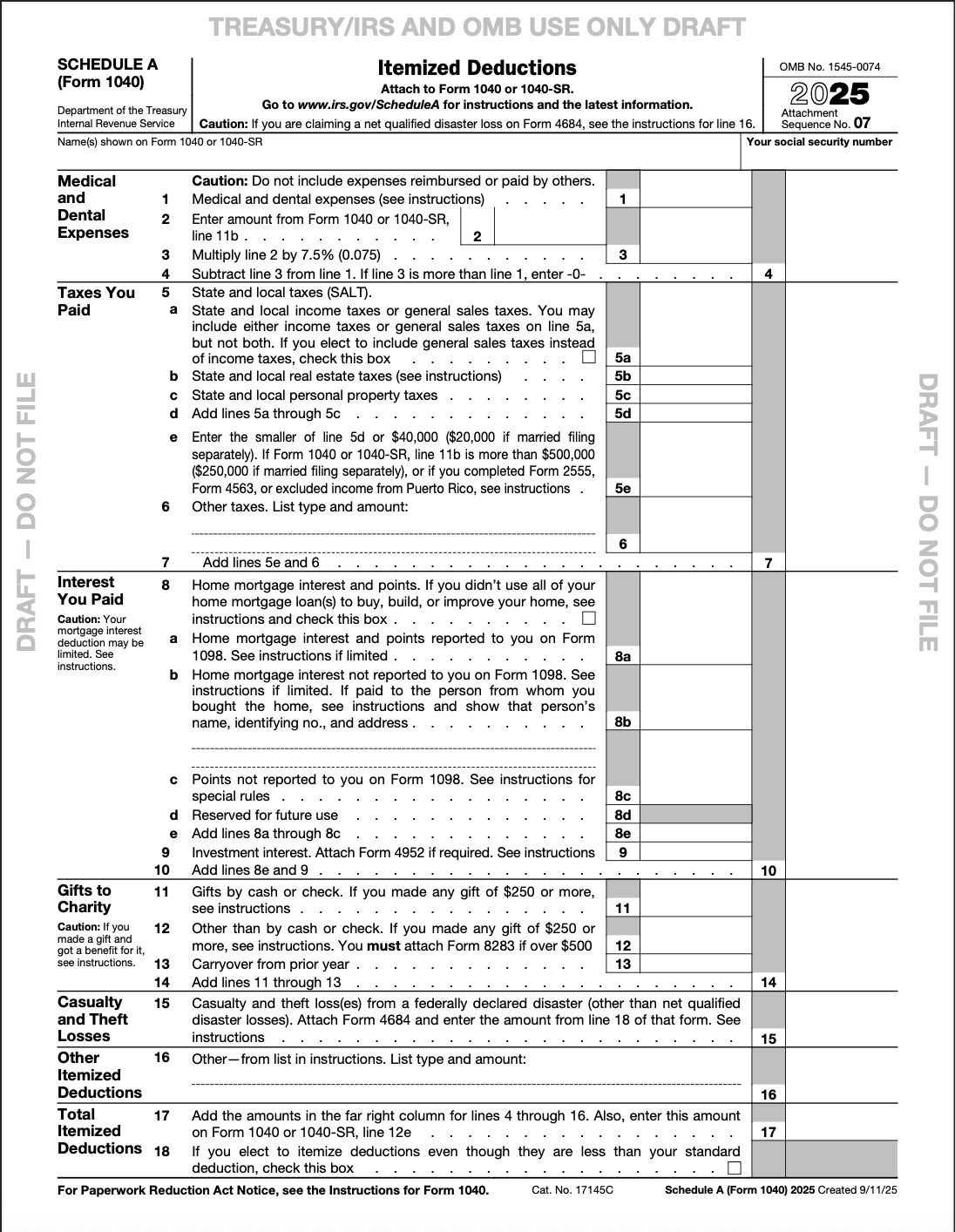Here’s a draft of Schedule A (Form 1040) which shows the common deductions if you itemize: